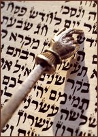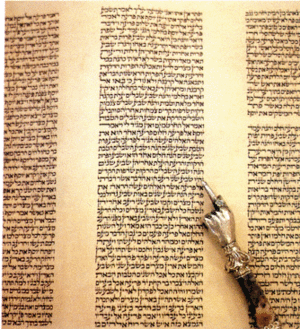 Torah scroll, containing the Law of Moses. Note the sterling silver Torah Pointer.