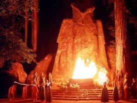 Molech worship fire ceremony in a grove of green trees.